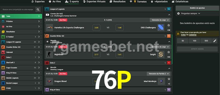 O 76P oferece uma grande seleção de opções de apostas em e-sports com probabilidades competitivas